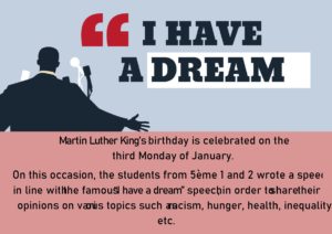 Martin Luther King’s birthday is celebrated on the third Monday in January. On this occasion, the students of 5ème 1 and 2 wrote a speech/poem in line with the famous