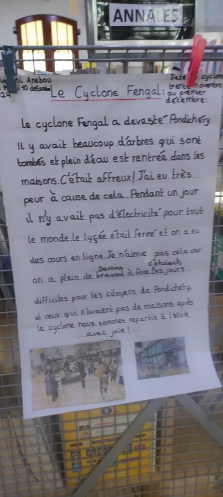 Dans la nuit du 30 novembre au 1er décembre dernier, le Cyclone Fengal a frappé la côte Sud-Est de l’Inde, touchant particulièrement notre belle ville de Pondichéry. Cet événement météorologique a eu un impact majeur sur la population locale, avec des vents violents, des pluies torrentielles et des dégâts importants dans les zones environnantes.